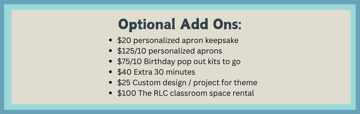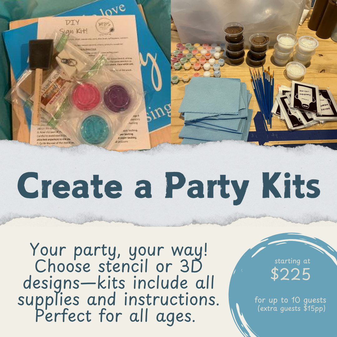 MBS has a variety of projects to choose from. Our party packages accommodate up to 10 guests (projects), with the option to add more for an extra fee. Most projects are ready to take home the same day, making them a perfect combination of party activity and take-home favor!