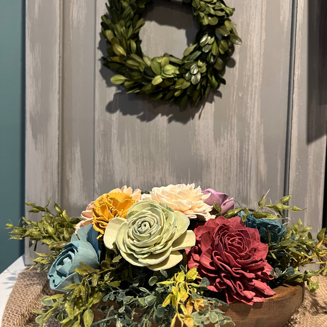 Join us for a cozy, creative workshop where you'll design a stunning centerpiece using handcrafted wood flowers arranged in a rustic dough bowl. Choose from beautiful early fall-inspired colors—think soft oranges, golden mustards, creamy whites, and hints of burgundy—paired with seasonal greenery and natural accents.