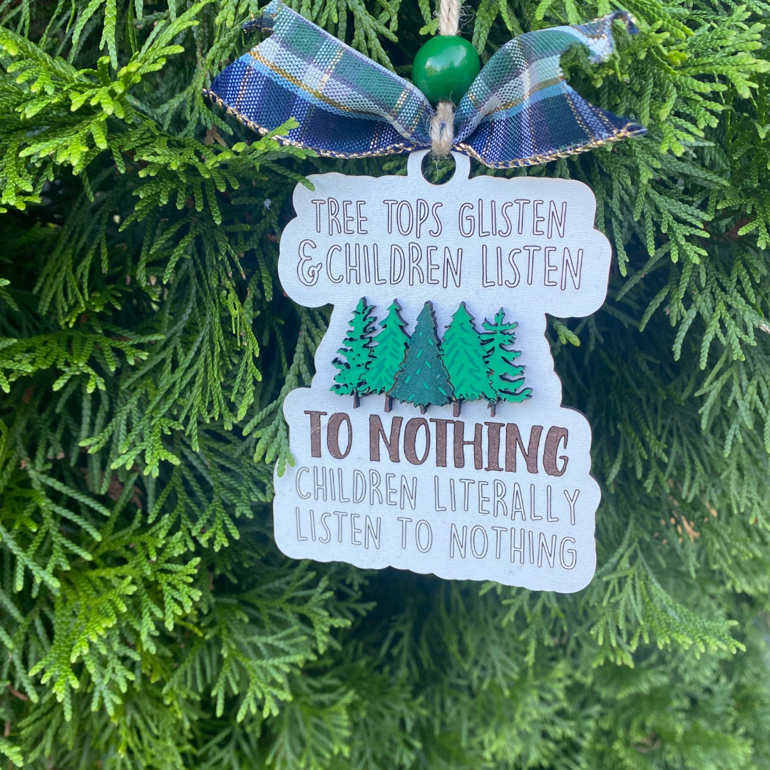 Tree Tops Glisten and Children Listen to NOTHING" Ornament: Add a playful twist to your holiday decor with this humorous ornament that reads, “Tree tops glisten and children listen to absolutely nothing.” Perfect for parents or caregivers, this lighthearted piece captures the joys and challenges of the holiday season. Hang it on your tree or gift it to a friend who appreciates a good laugh. This fun ornament is sure to bring smiles and spark conversations during the festivities!