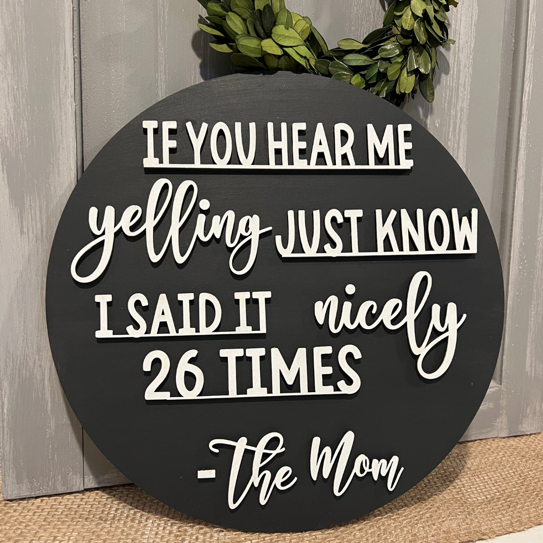 "Add some humor to your home decor with our 3D round wood sign that reads 'If you hear me yelling, just know I said it nicely 26 times' signed 'The mom.' Perfect for any parent with a sense of humor and a story to tell."