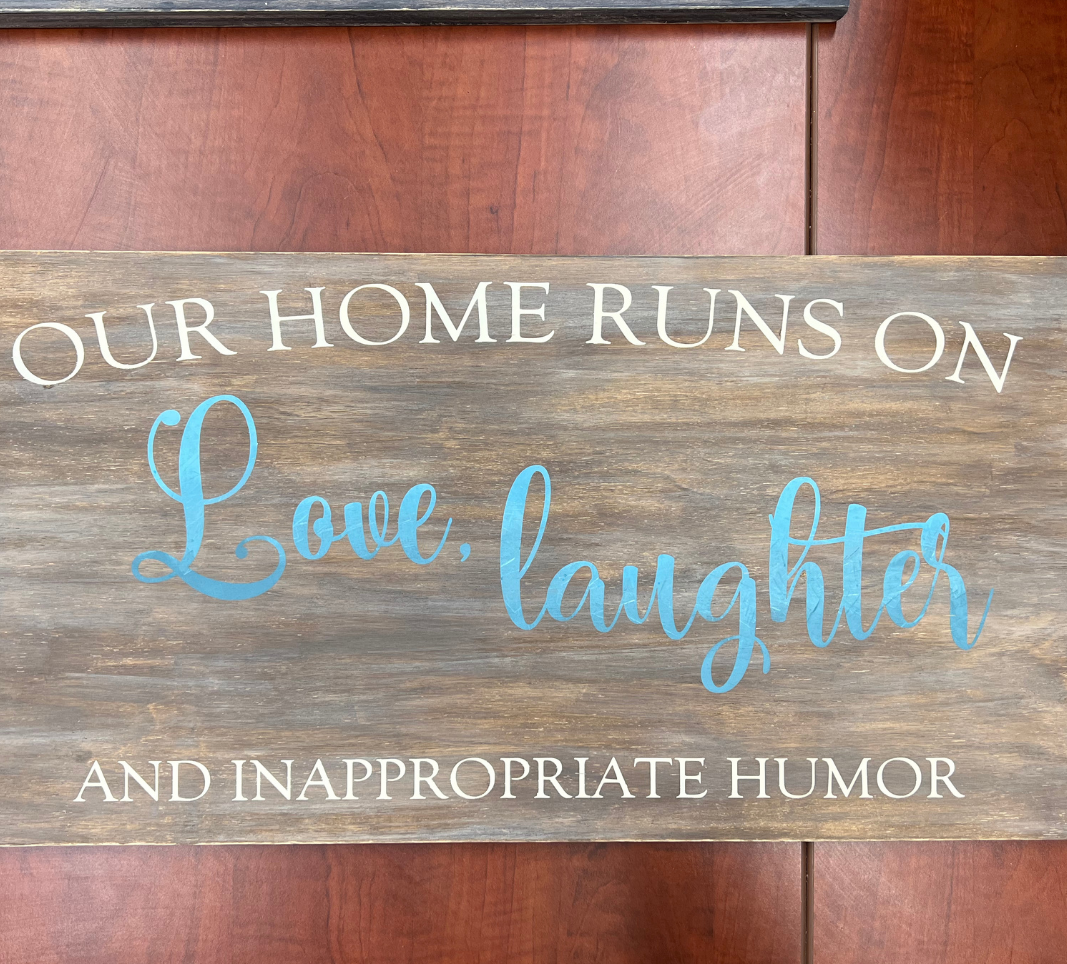 Infuse your home with a dose of humor and heart with our delightful sign that proudly declares, 'Our home runs on love, laughter, and inappropriate humor.' Crafted with a touch of wit and warmth, this wood sign adds a playful and welcoming spirit to your home decor. Whether displayed prominently or shared as a quirky gift, let this sign be a lighthearted celebration of the unique blend of joy that defines your household