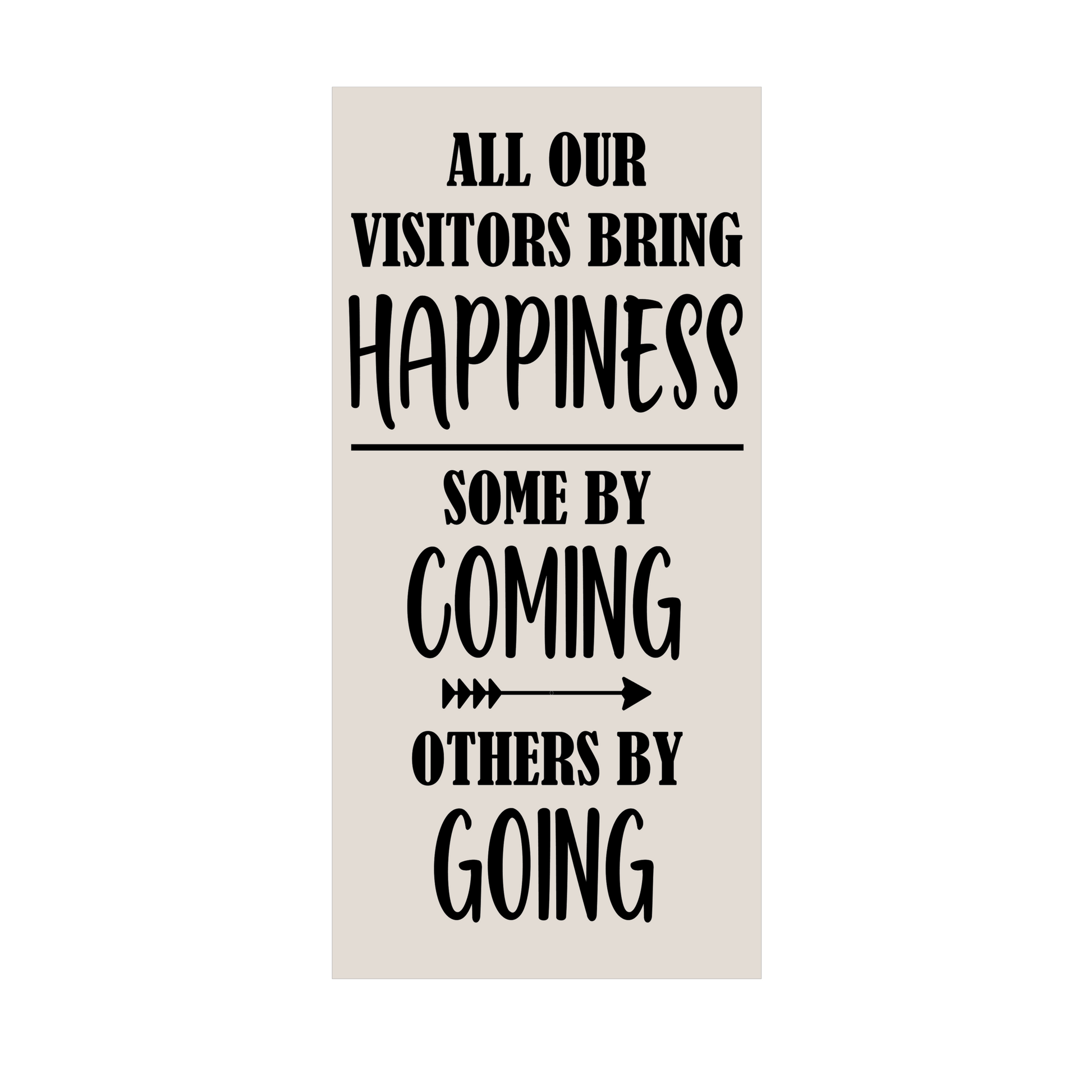 Welcome humor and happiness into your space with our charming sign that declares, 'All our Visitors bring Happiness—some by coming, some by going.' Crafted with a playful spirit, this wood sign adds a touch of whimsy to your home decor. Whether placed in the entryway or shared as a lighthearted gift, let this sign bring smiles and laughter, celebrating the joy that comes with every visit, arrival, and departure.