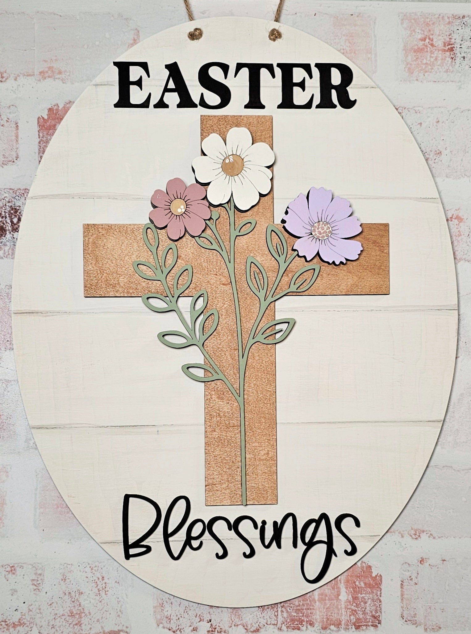 Transform your home into a sacred space with our Easter Blessings wooden doorhanger. Crafted in an oval shape, the cross and blooming flowers are a beautiful reminder of the meaningful holiday. Invite the spirit of Easter in with a heartfelt message - perfect for welcoming guests or gifting to loved ones.