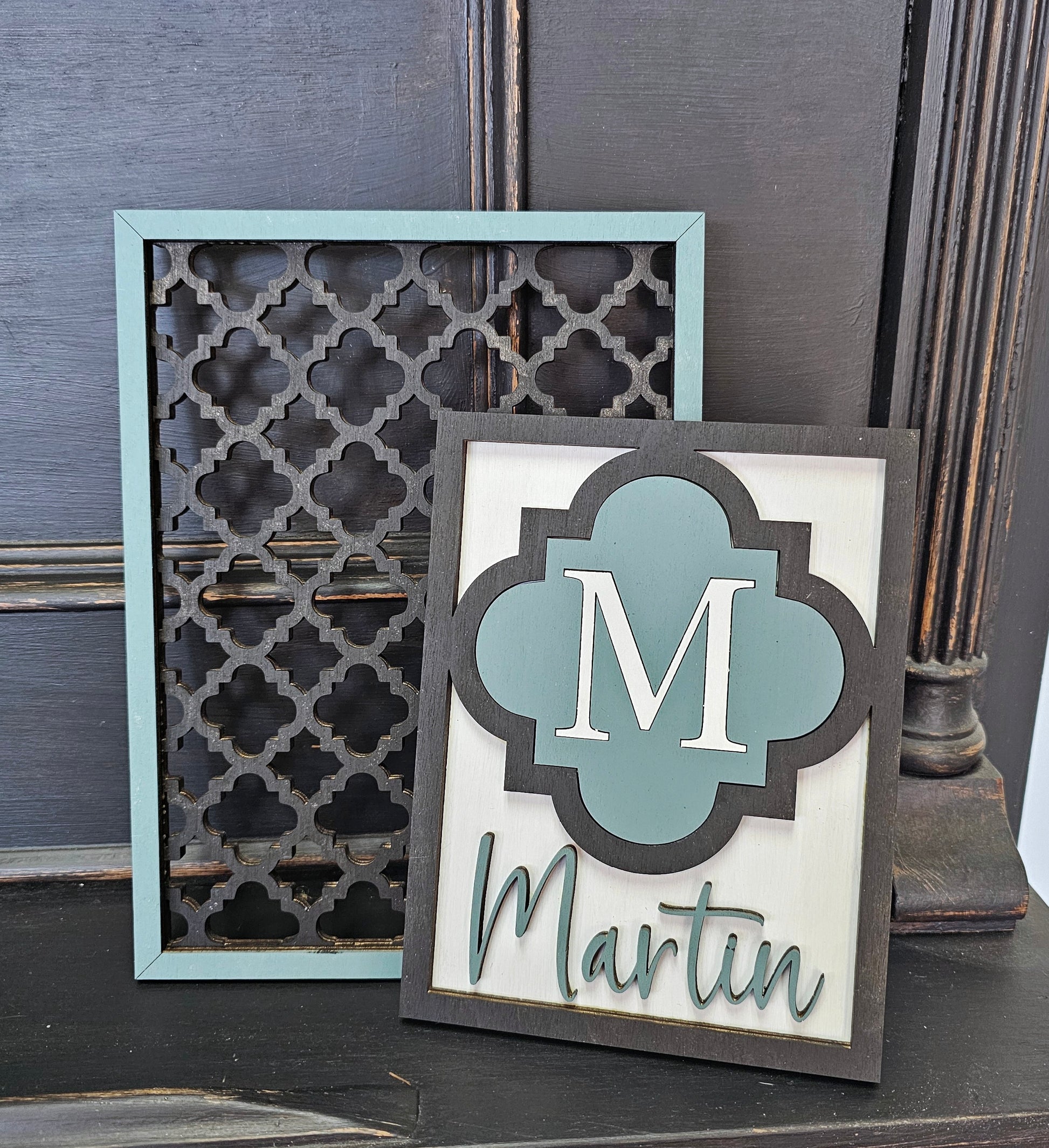 Introducing our Family Name Duo - a charming two piece set that includes a beautiful quatrefoil design wood cutout and a personalized name and initial design. Perfect for adorning shelves or mantels, this set adds a personalized touch to any room.
