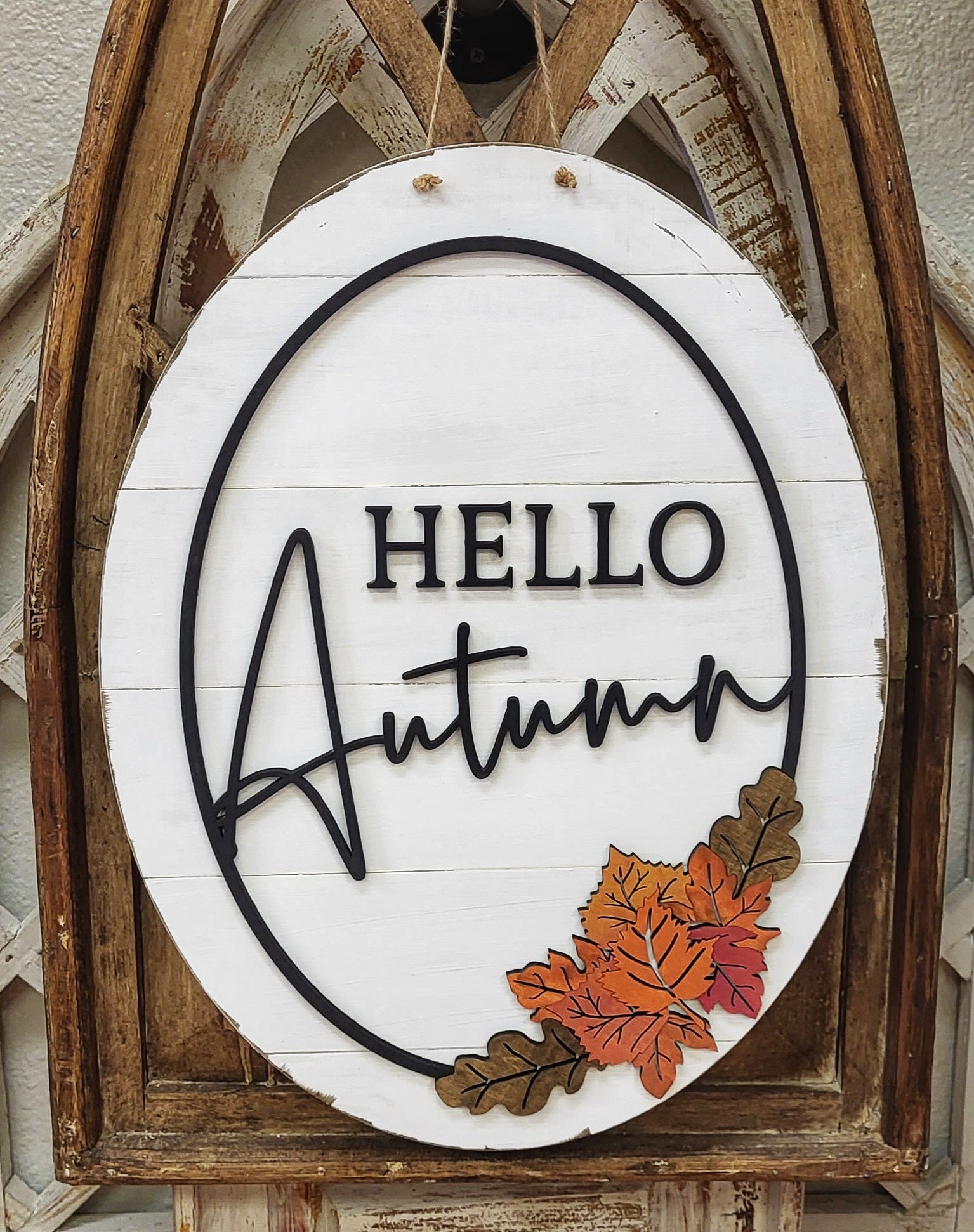 Welcome fall with our Hello Autumn oval 3d door hanger. Made with oval shiplap and 3d layered sign, it adds a warm and rustic touch to your home decor. Perfect for seasonal decorations and welcoming guests.