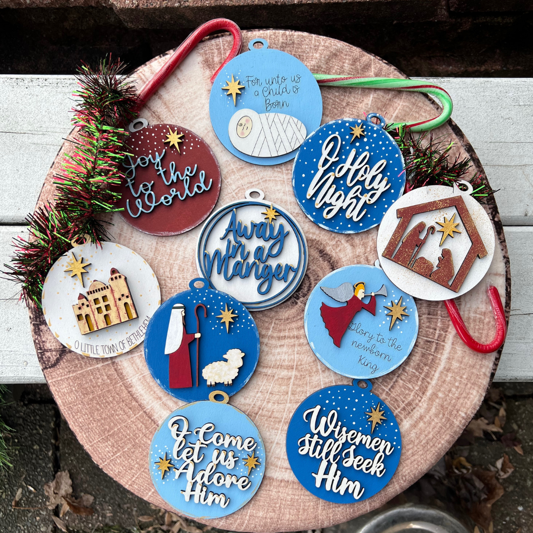 Celebrate Christmas with these unique Nativity ornaments made of layered wood. Bring the joy of the season into your home with this playful and quirky set. Perfect for any holiday decor, add a touch of whimsy to your tree with these fun and festive ornaments.
