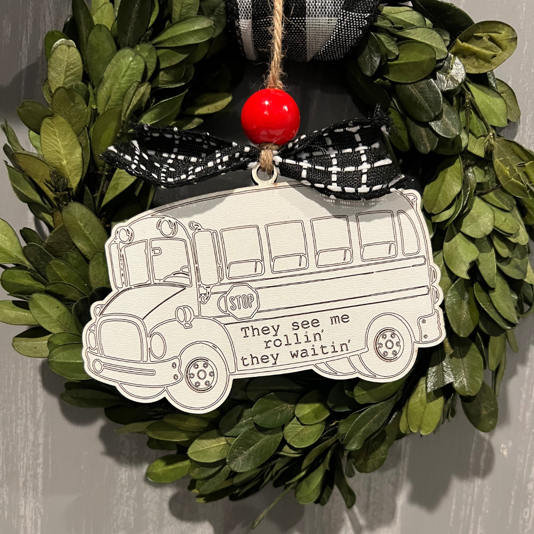 They See Me Rollin', They Waitin' - School Bus Ornament: Add a touch of humor to your holiday decor with our "They See Me Rollin', They Waitin'" school bus ornament! This playful ornament captures the spirit of school days and is perfect bus drivers, or anyone who loves a good laugh. Made with precision and care, this whimsical ornament will brighten up your tree and bring a smile to all who see it. Celebrate the fun side of education and gift this unique ornament to friends or family who appreciate a lighthearted touch during the festive season.